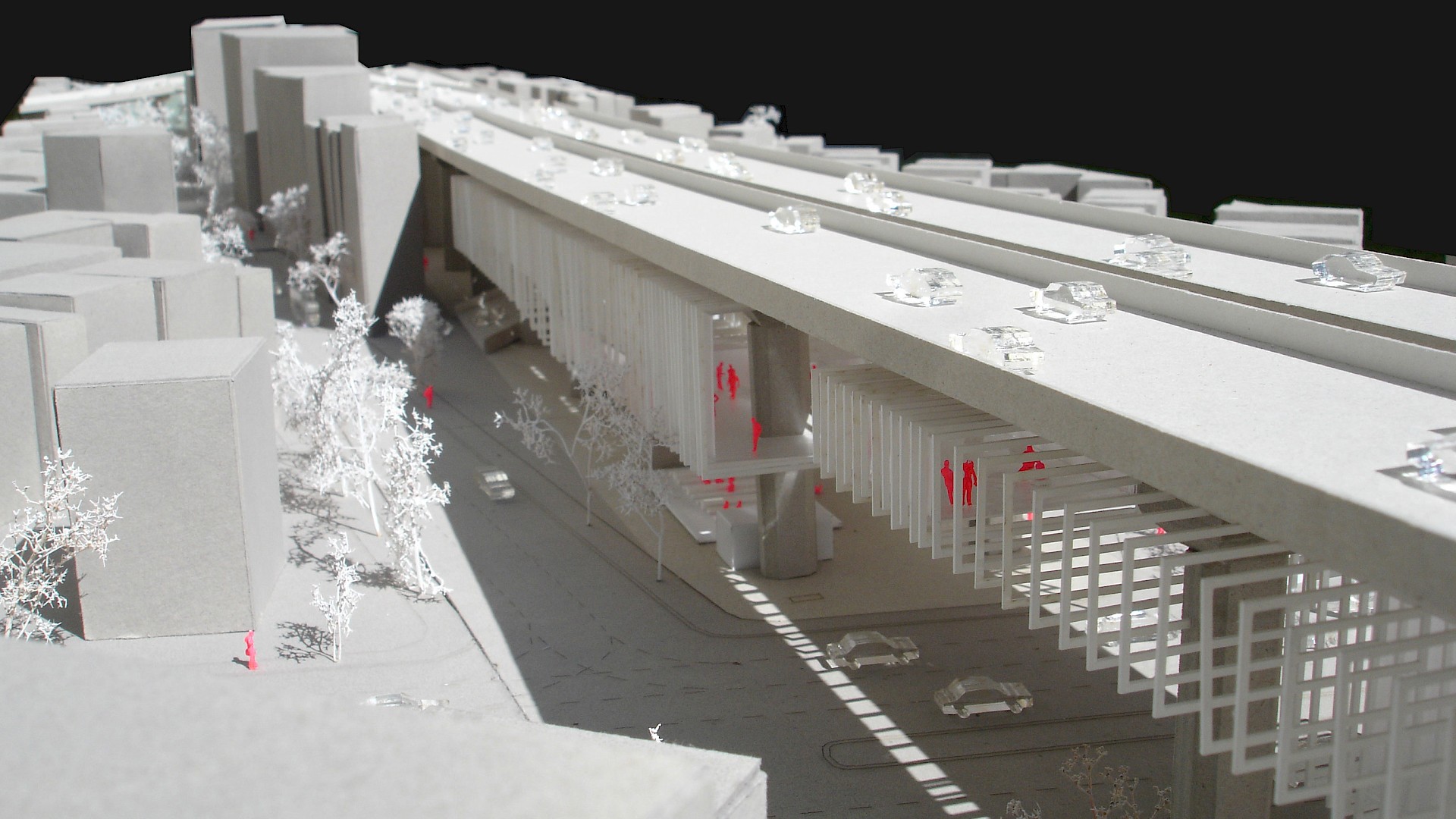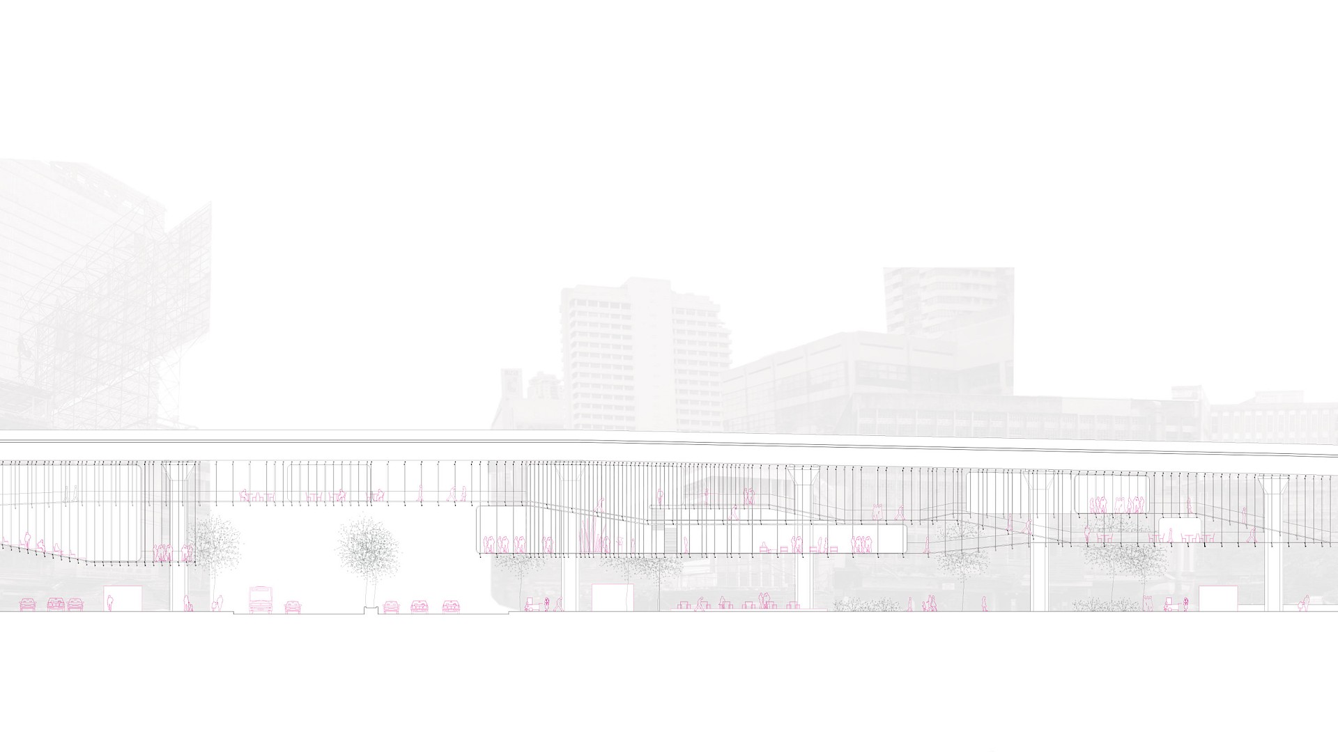 Up-side Down Bangkok is a large-scale design intervention conceived as a suspended leisure infrastructure. This project explores the latent potential of Bangkok’s leftover spaces beneath elevated expressways, often perceived as residual and divisive urban conditions. Rather than treating these urban scars as negative by-products of infrastructure, the proposal reframes them as opportunities for appropriation and reconnection between fragmented neighborhoods. By suspending a sequence of public programs—ranging from cultural and leisure spaces to informal social venues—beneath the bridge structure, the project activates these sheltered zones as continuous pedestrian environments. Protected from sun and rain by the massive concrete infrastructure, the spaces encourage wandering, social interaction, and new forms of urban life, transforming neglected territories into active components of the city.