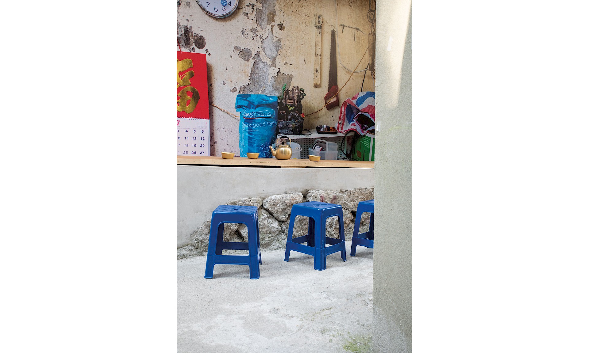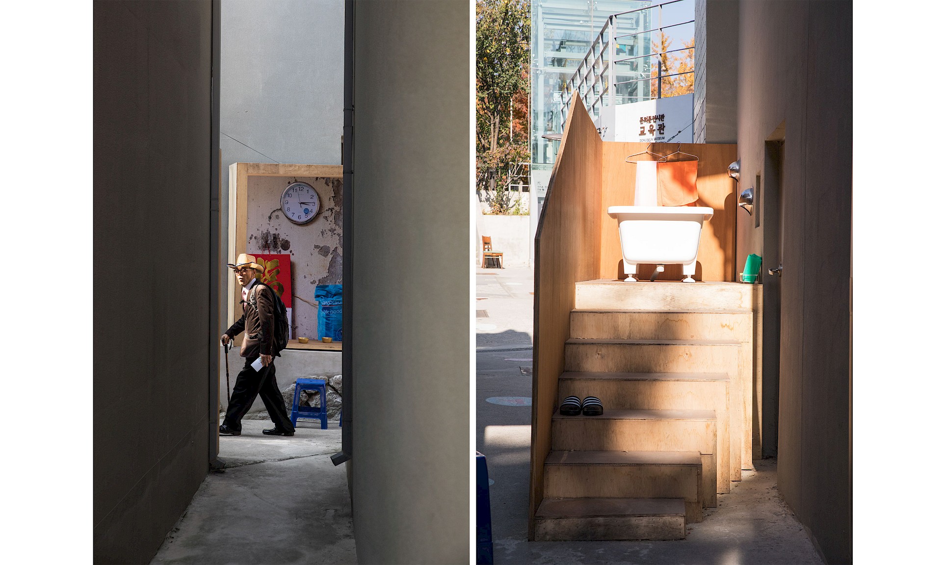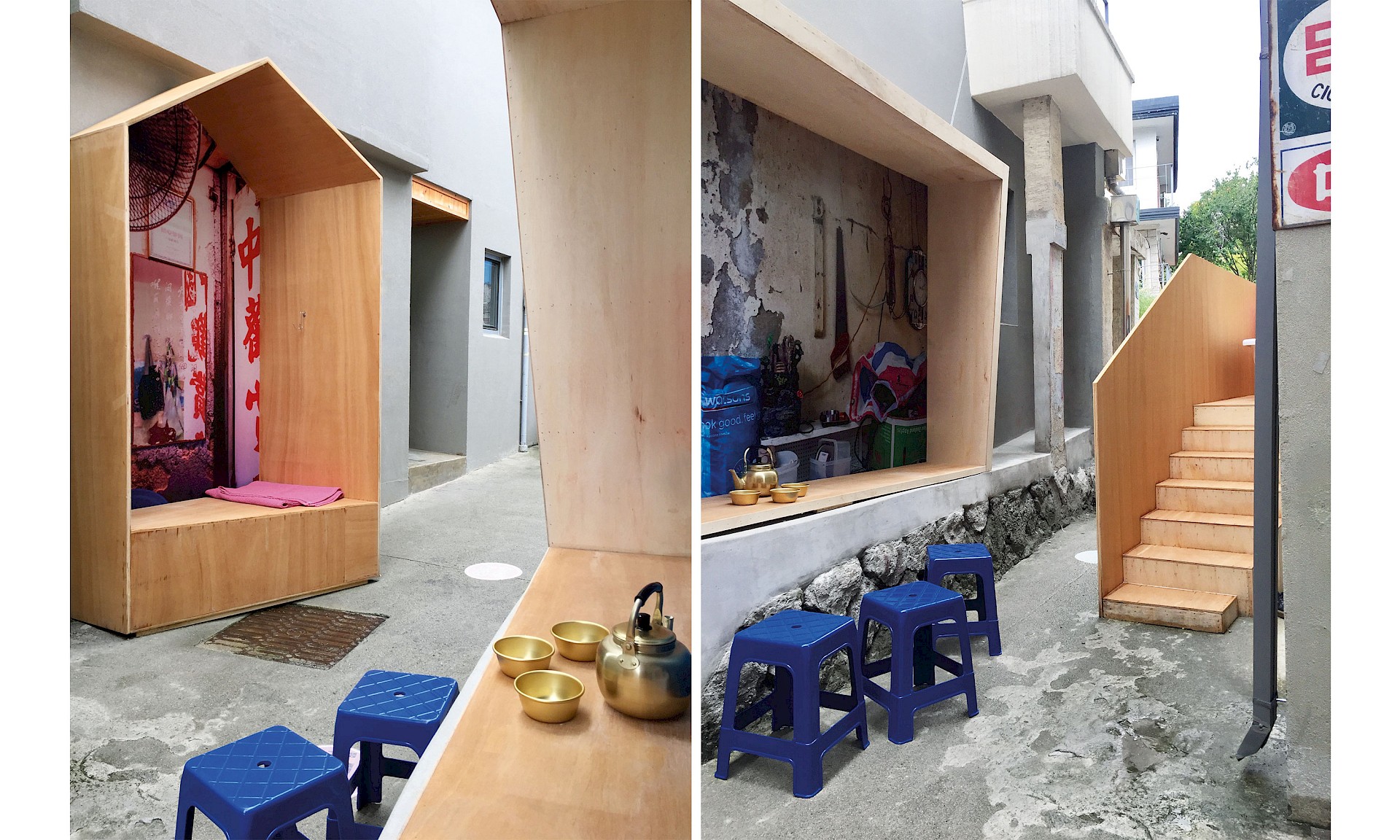 Inverted Hong Kong was an installation on show at the Cities Exhibition during the Seoul Biennale of Architecture and Urbanism. Located within the recently renovated Donuimun Village, the installation played with the boundary lines of an interstitial lane. The audience was challenged with representing a city as a system of thresholds where the domestic and the collective overlap. This spatial setup was an opportunity to transpose the reflections and insights gained during the observation and testing of liminal sites in Hong Kong, mapping them to another interstitial site in Seoul.