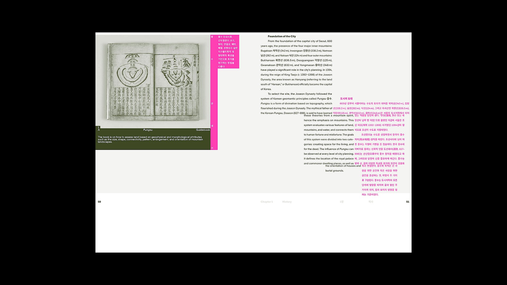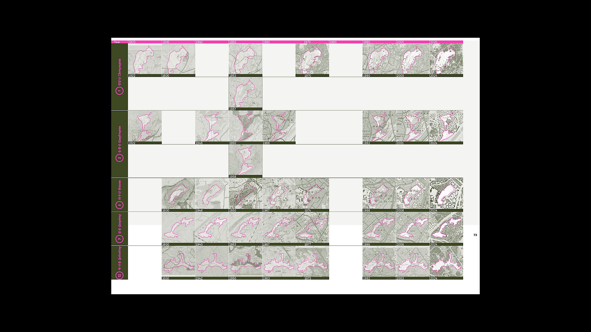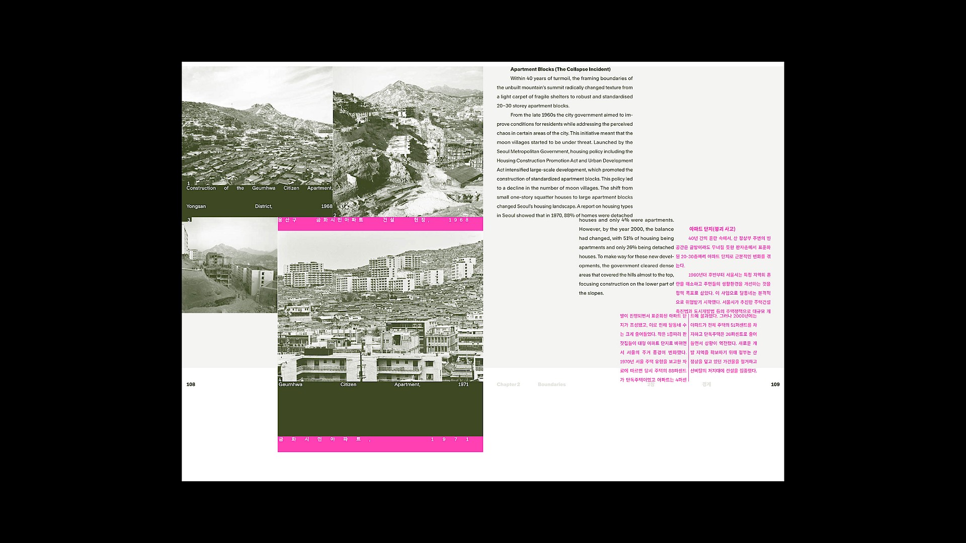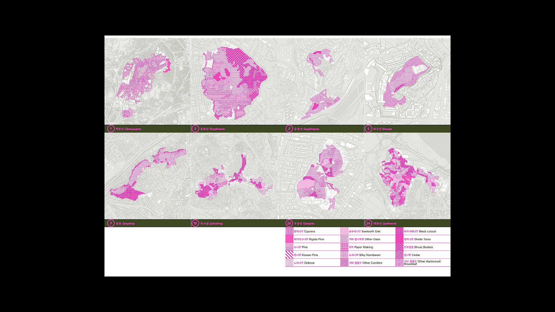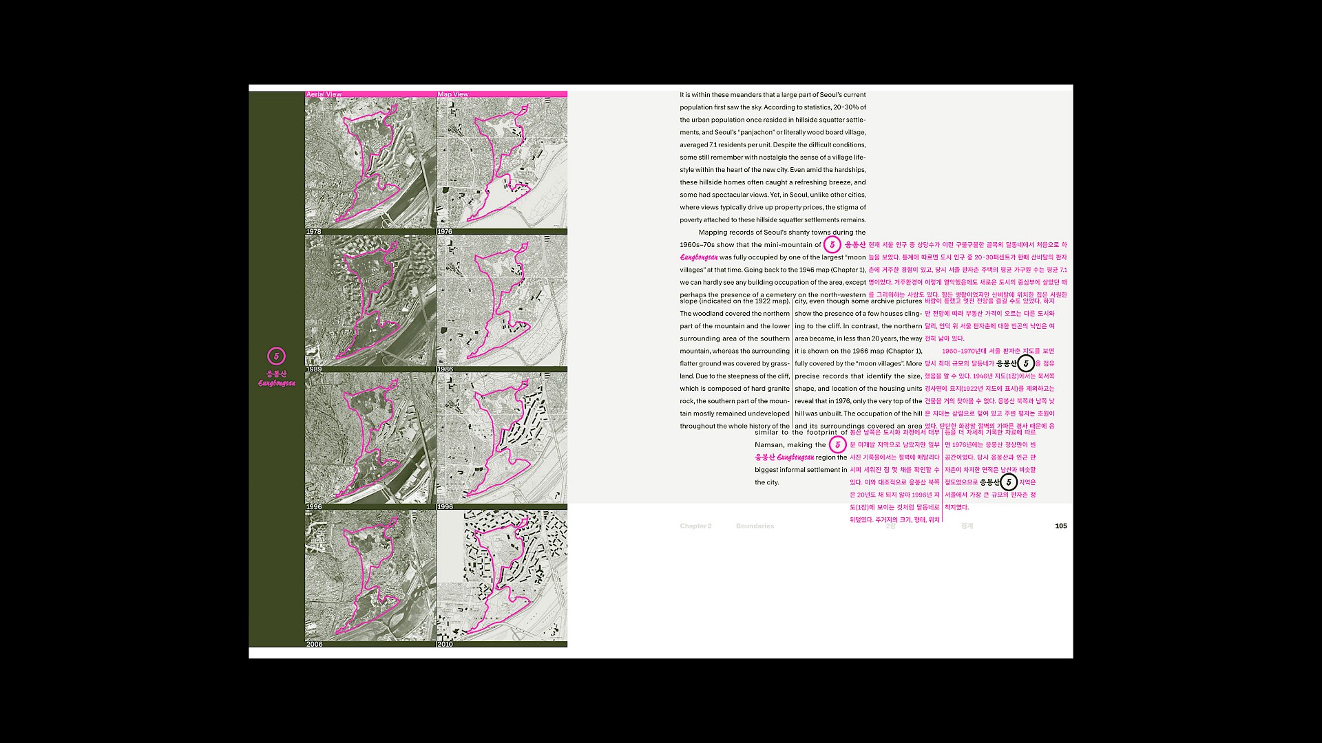 Seoul Mini-Mountains: Reading the City from its Topographical Gaps rethinks the city through its unbuilt topography—two dozen mini-mountains scattered across the urban fabric. These residual peaks, rising between 66 and 200 meters, resist the momentum of development and form a quiet counterpoint to the city’s dense expansion. Often overlooked and unrecognized as cultural landmarks, they serve as spatial buffers that allow the city to breathe. Through mapping, historical analysis, and the observation of everyday activities, the book constructs a new urban narrative—one that values voids, questions boundaries, and imagines Seoul as an archipelago of topographical gaps.