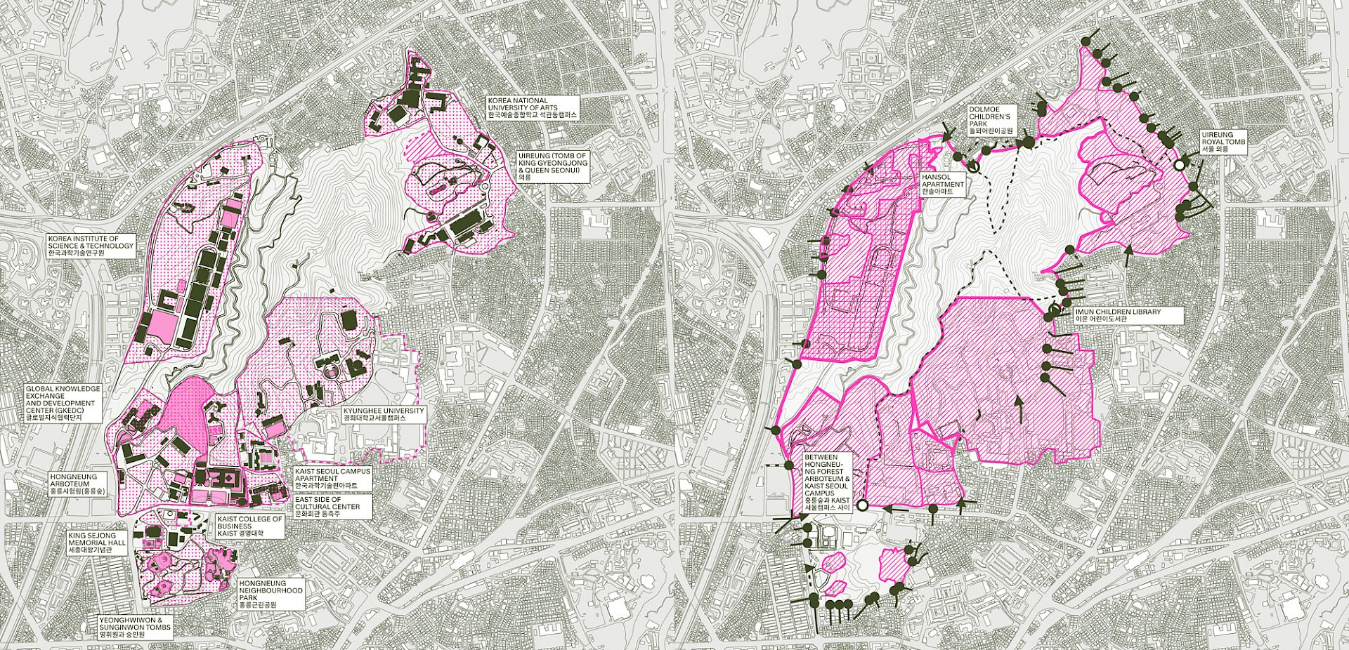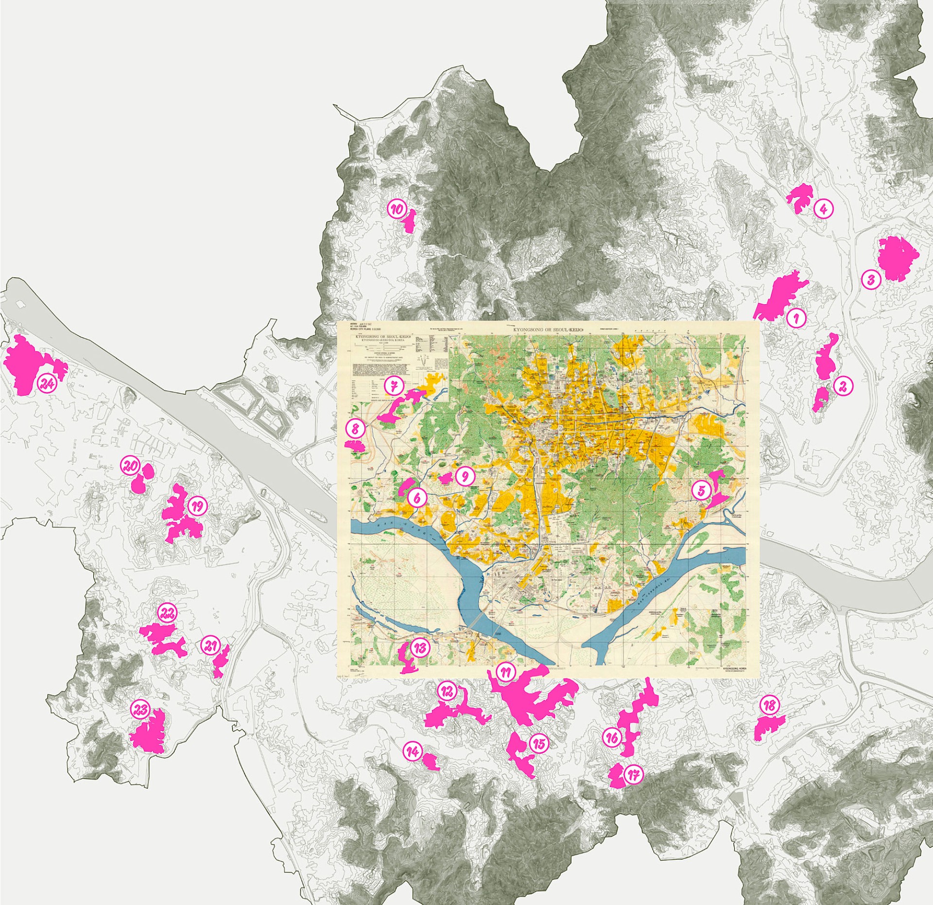 Seoul Mini-Mountains is a research project that explores the overlooked mountain remnants embedded within the dense urban fabric of Seoul. These steep, irregular fragments—often excluded from formal development—exist at the intersection of ecology, topography, and urban marginality. Through mapping, fieldwork, and photographic observation, the project reconsiders these terrains as liminal spaces of resistance and potential. Rather than treating them as leftover or inaccessible, the research reframes them as spatial gaps that invite new readings of the city—where nature is not erased, but actively shapes urban experience and imagination.