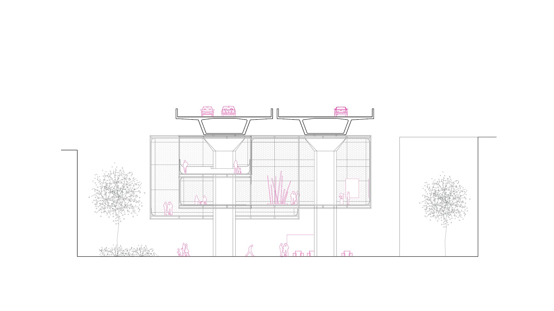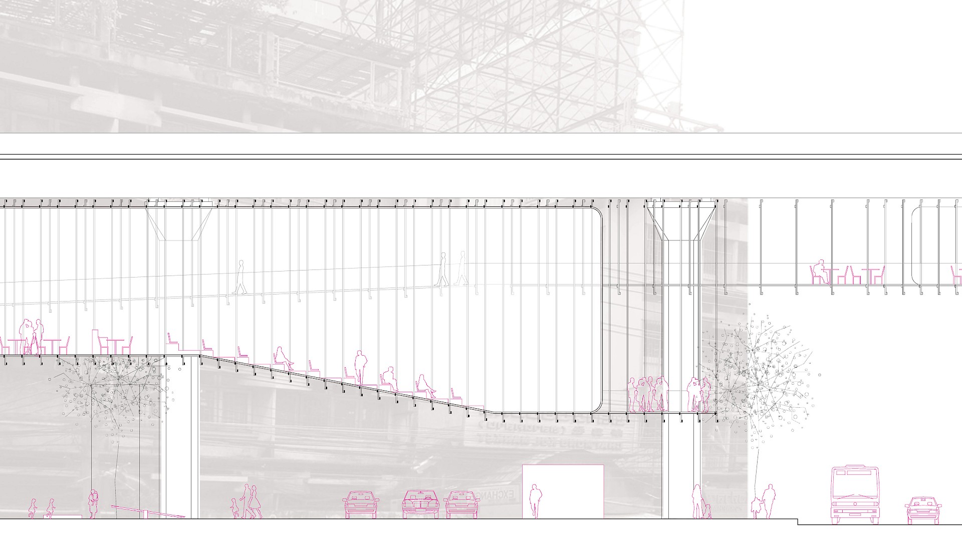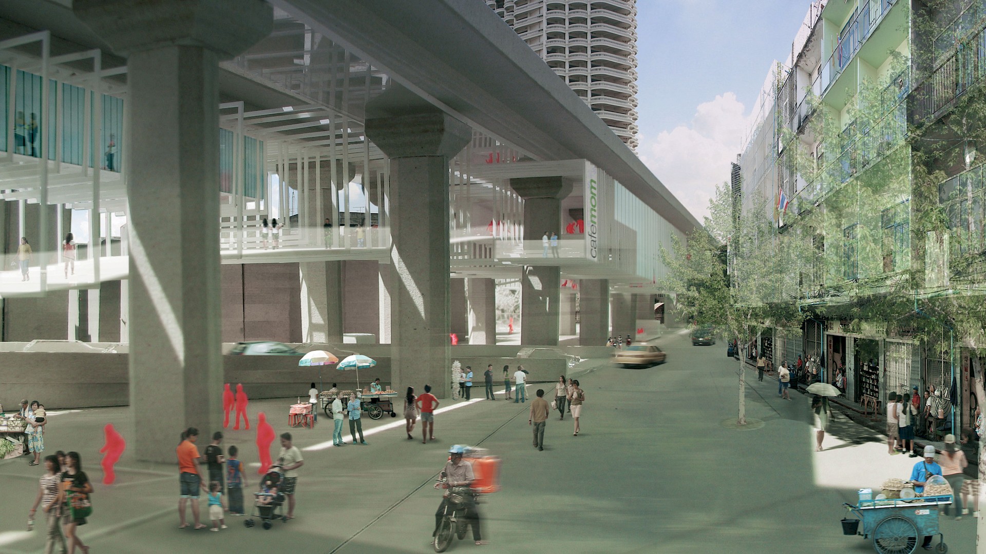 Up-side Down Bangkok is a large-scale design intervention conceived as a suspended leisure infrastructure. This project explores the latent potential of Bangkok’s leftover spaces beneath elevated expressways, often perceived as residual and divisive urban conditions. Rather than treating these urban scars as negative by-products of infrastructure, the proposal reframes them as opportunities for appropriation and reconnection between fragmented neighborhoods. By suspending a sequence of public programs—ranging from cultural and leisure spaces to informal social venues—beneath the bridge structure, the project activates these sheltered zones as continuous pedestrian environments. Protected from sun and rain by the massive concrete infrastructure, the spaces encourage wandering, social interaction, and new forms of urban life, transforming neglected territories into active components of the city.