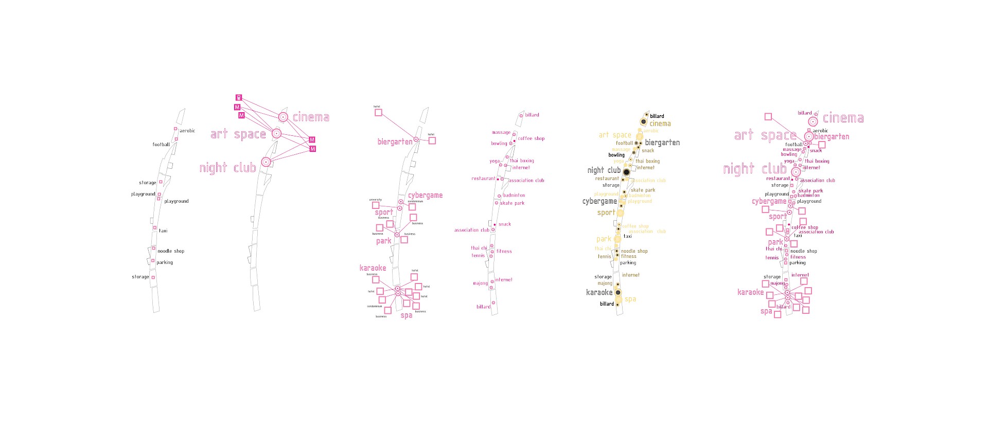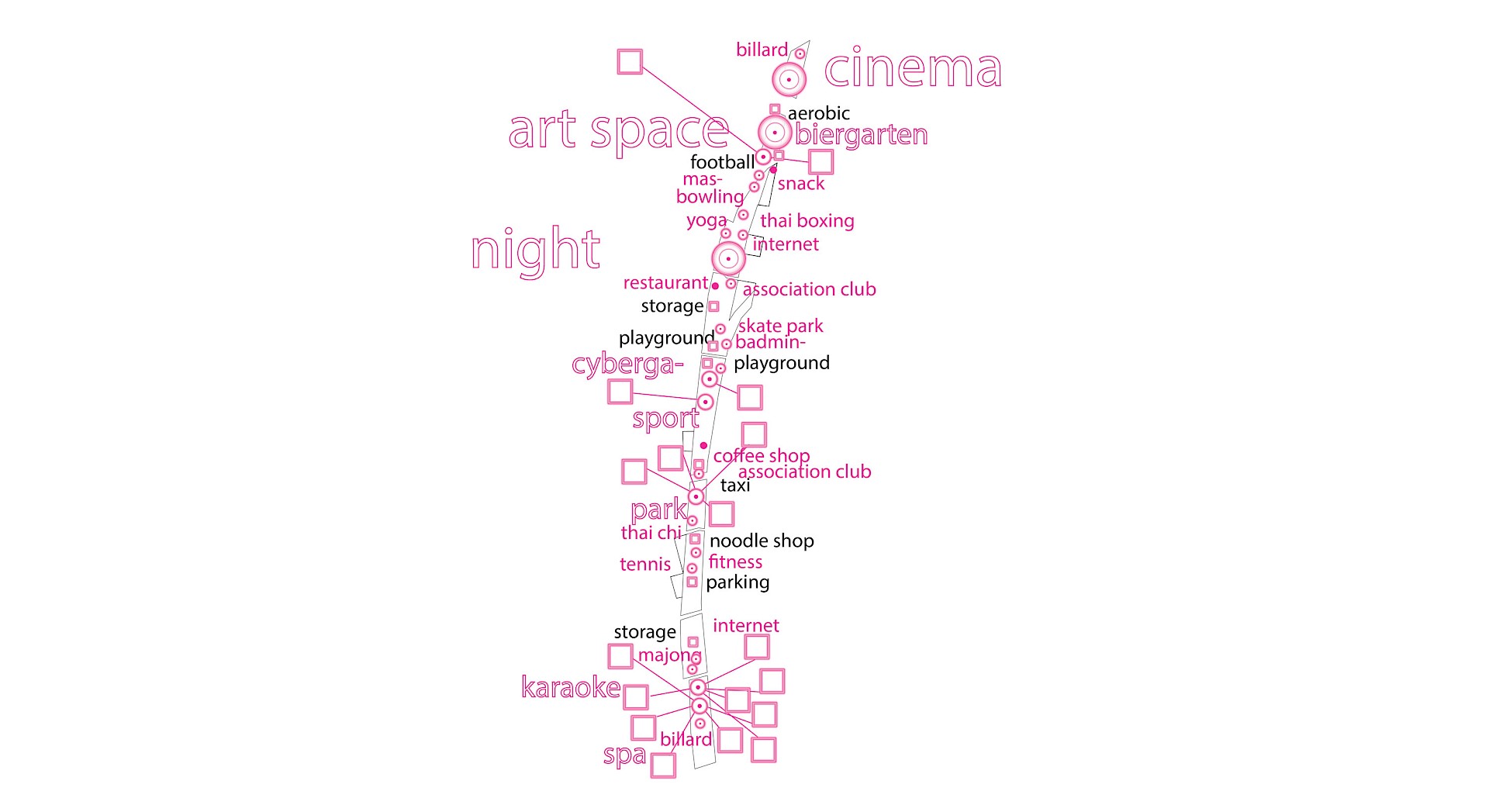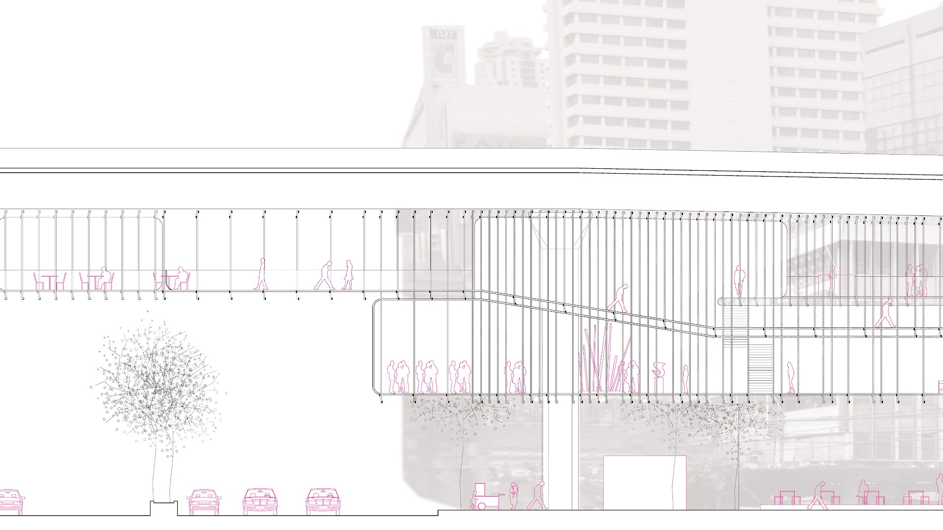 Up-side Down Bangkok is a large-scale design intervention conceived as a suspended leisure infrastructure. This project explores the latent potential of Bangkok’s leftover spaces beneath elevated expressways, often perceived as residual and divisive urban conditions. Rather than treating these urban scars as negative by-products of infrastructure, the proposal reframes them as opportunities for appropriation and reconnection between fragmented neighborhoods. By suspending a sequence of public programs—ranging from cultural and leisure spaces to informal social venues—beneath the bridge structure, the project activates these sheltered zones as continuous pedestrian environments. Protected from sun and rain by the massive concrete infrastructure, the spaces encourage wandering, social interaction, and new forms of urban life, transforming neglected territories into active components of the city.