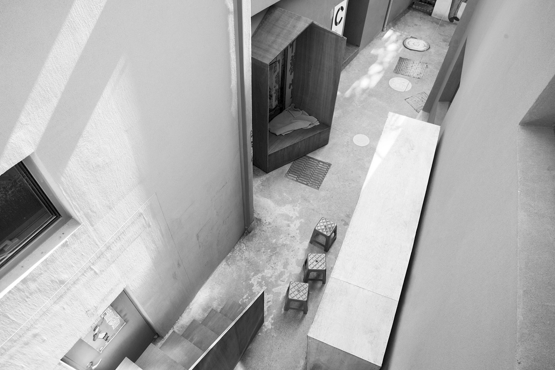 Hong Kong’s interstitial network of back lanes within the city’s dense urban fabric are ambiguous buffer zones, which oscillate between the classical binary opposition of public/private, legal / illegal, inside / outside. Not planned as such, they are not assigned to particular functions or programs, and are often ignored by the city’s officials. However, these in-between territories are open to multiple interpretations and offer a momentary space for the city’s inhabitants to appropriate.