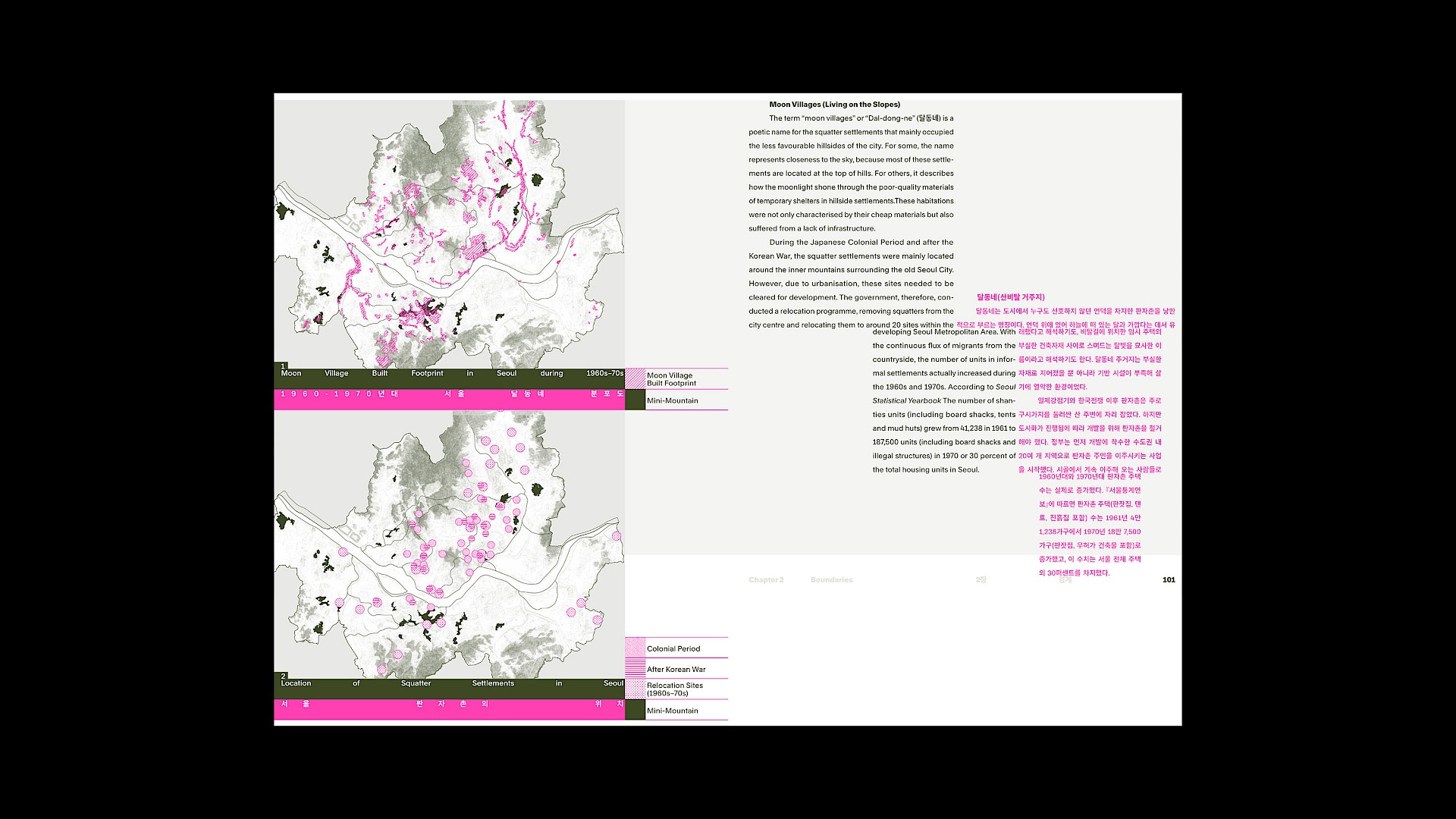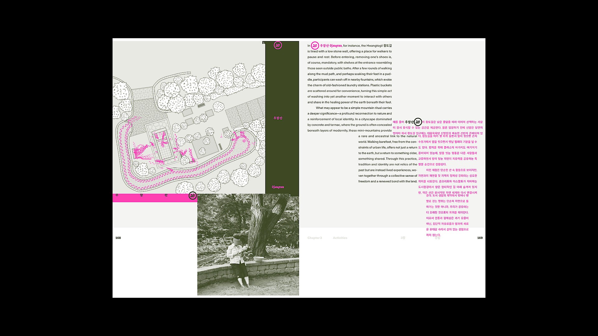 Seoul Mini-Mountains: Reading the City from its Topographical Gaps rethinks the city through its unbuilt topography—two dozen mini-mountains scattered across the urban fabric. These residual peaks, rising between 66 and 200 meters, resist the momentum of development and form a quiet counterpoint to the city’s dense expansion. Often overlooked and unrecognized as cultural landmarks, they serve as spatial buffers that allow the city to breathe. Through mapping, historical analysis, and the observation of everyday activities, the book constructs a new urban narrative—one that values voids, questions boundaries, and imagines Seoul as an archipelago of topographical gaps.